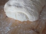 - riprendo l’impasto che ha raddoppiato il suo volume, spolverizzo la tavola con la farina e inserendo le dita sotto l’impasto lo accompagno allargando a rettangolo, formo le tre pieghe e spolverizzo sempre con un velo di farina; in tutti i passaggi ho utilizzato circa 1 cucchiaio raso di farina