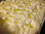- ho praticato le fossette premendo leggermente le dita sull’impasto, ho preparato l’emulsione e l’ho versata su tutto l’impasto spargendola con le dita, ho versato il sale grosso e ho lasciato riposare per 1 ora mentre portavo il forno a temperatura di 250°