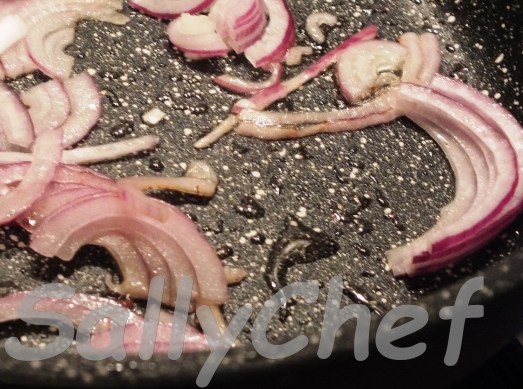 - – per tutte le preparazioni – in tegame cuoci a fiamma bassa la cipolla tagliata grossolanamente con un pizzico di sale e un piccolo ramo di rosmarino, quando la cipolla sarà diventata trasparente unisci la mortadella, anche questa tagliata a fette, fai insaporire per un minuto, elimina il rosmarino e versa nel frullatore per ottenere una crema, se serve aggiungi il brodo vegetale