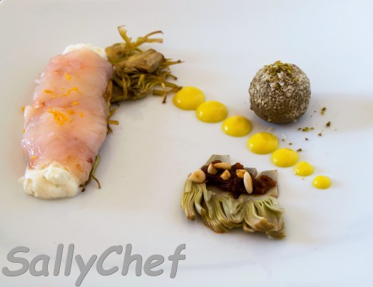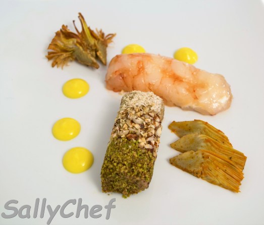 - nel piatto: sistemo il cannolo di mazzancolle con scorza d’arancio, il cilindro (o rocher) di fegatini, i carciofi e completo con la salsa allo zafferano.