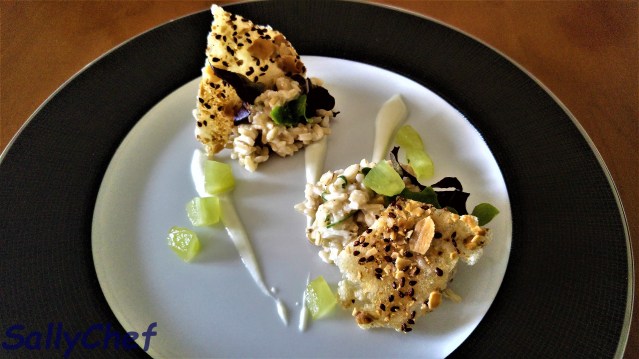 • diluisco la crema di Robiola con un po’ di succo d’uva da versare sul piatto, dispongo il riso e decoro con la cialda di riso e la frutta.