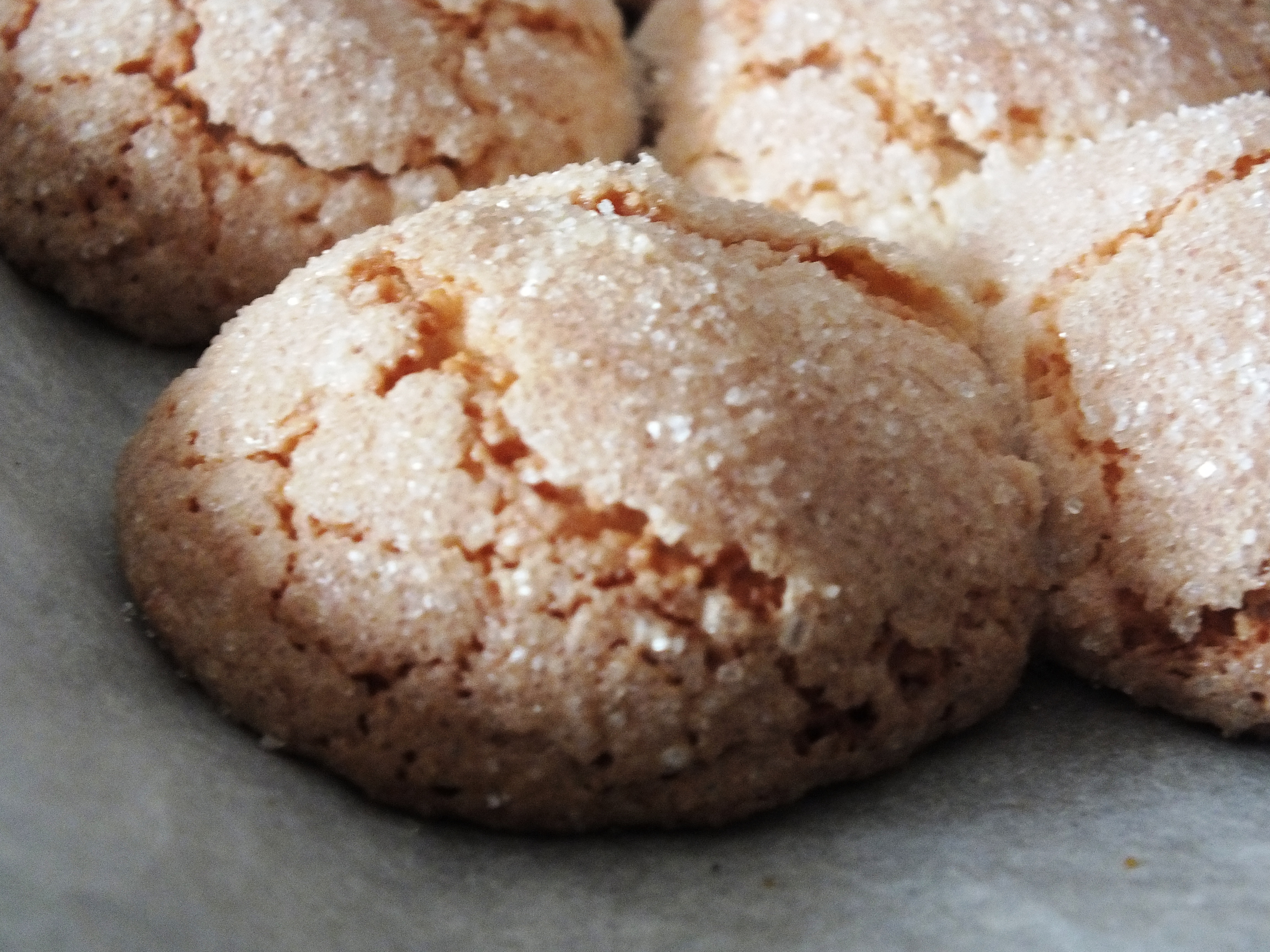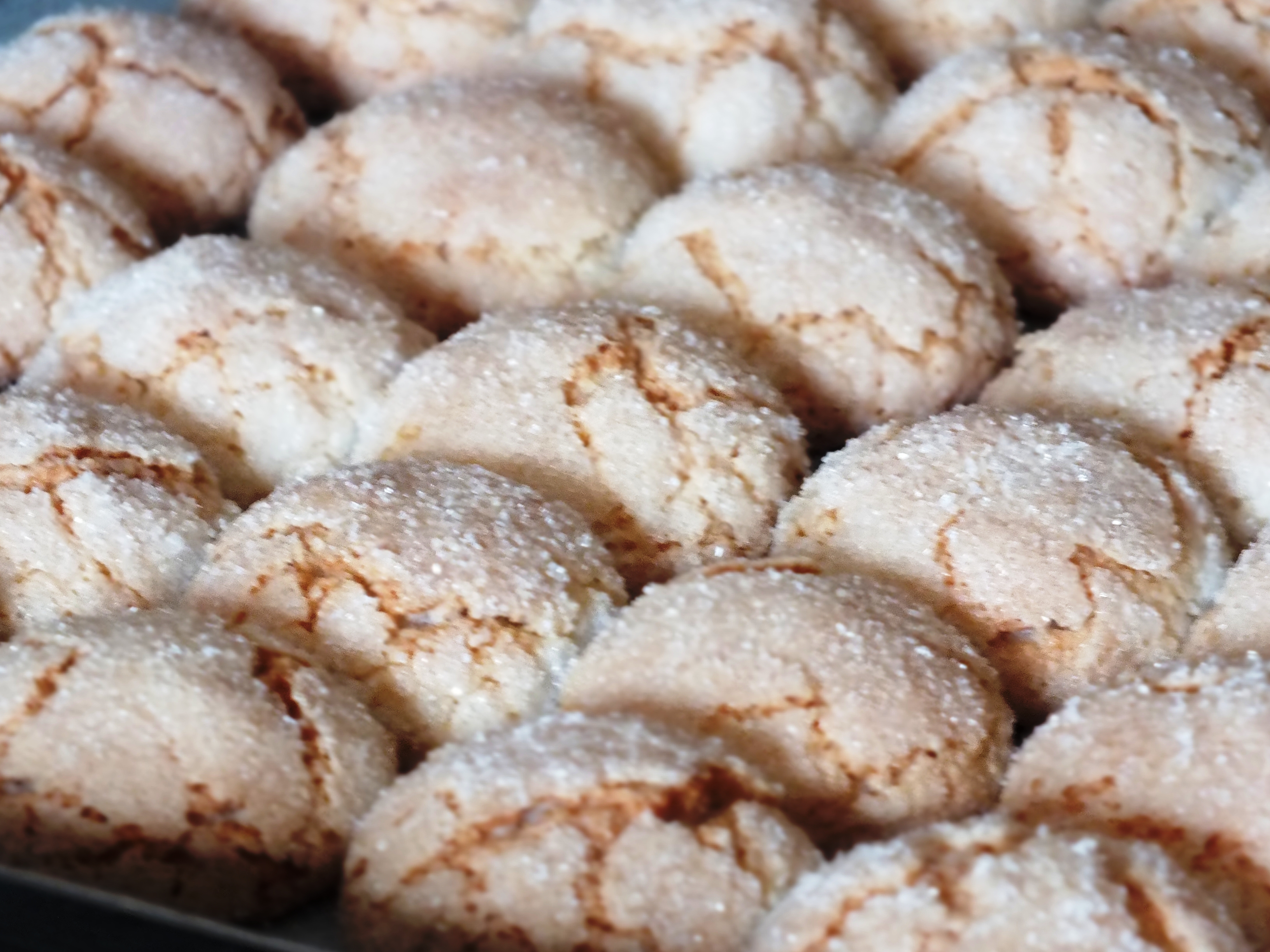 - inumidisci le mani e prepara delle sfere lavorando l’impasto, passale nello zucchero come faresti con le polpette nel pangrattato e disponi sulla teglia, lascia spazio sufficiente tra un amaretto e l’altro, perchè in cottura tenderanno ad allargarsi.